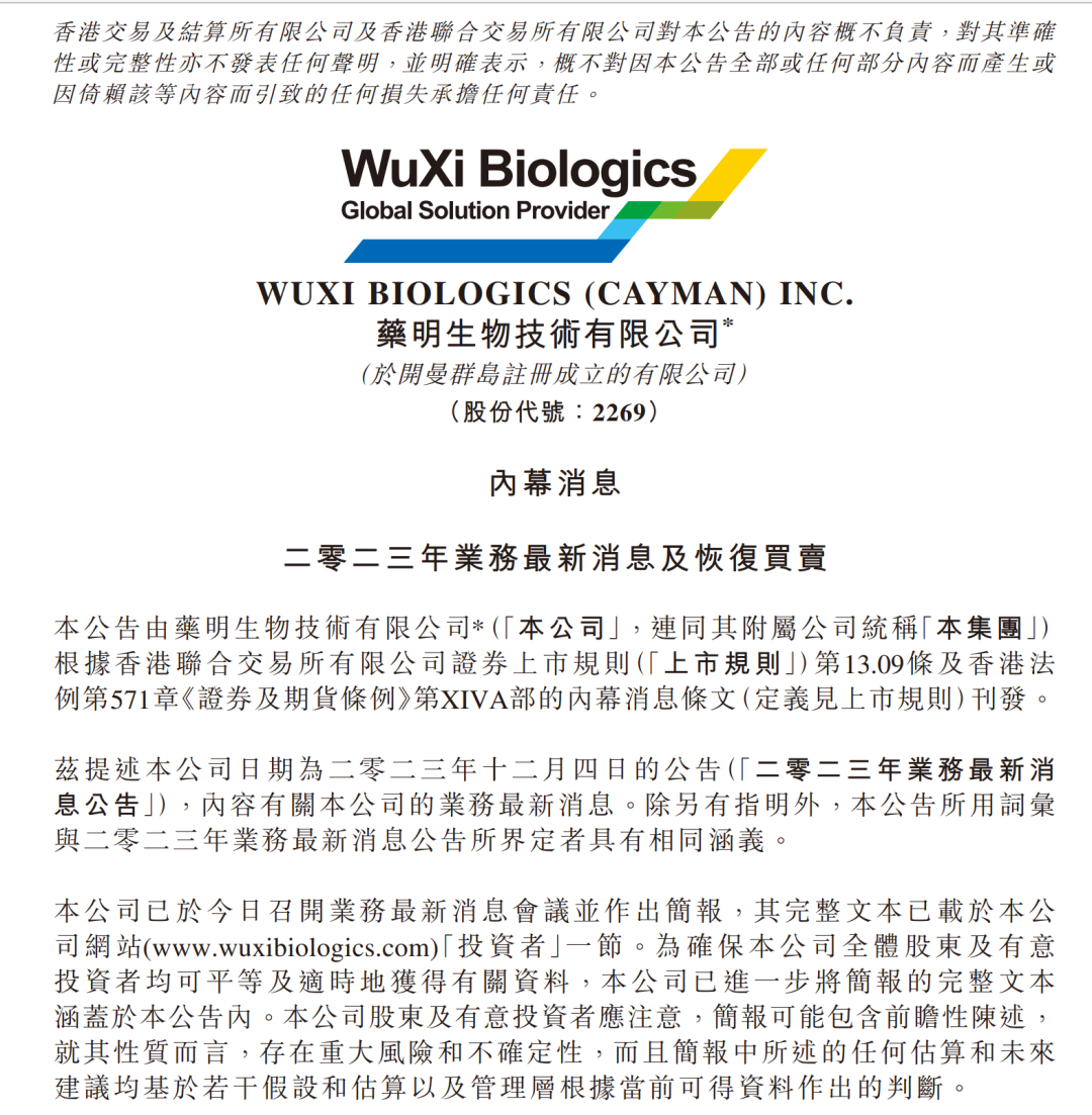 12月4日深夜,药明生物发布公告,表示集团的业务营运及财务状况维持强劲势头,且其业务营运及财务状况并未发生重大不利变动。尽管生物技术融资放缓导致生物技术行业呈个位数年增长率,且其COVID-19相关项目的收入下降及几个重磅药的生产延期,导致2023年目标收入增长低于预期,但公司仍对未来前景保持乐观,2023年实现整体收入约10%增长,并将继续投资提升能力及产能,以在2024年及2025年保持强劲的毛利率及增长率。展望未来,公司相信毛利率及增长率于2023年最具挑战,并预期于2024年下半年逐步回暖。12月5日起,药明生物股票恢复买卖。