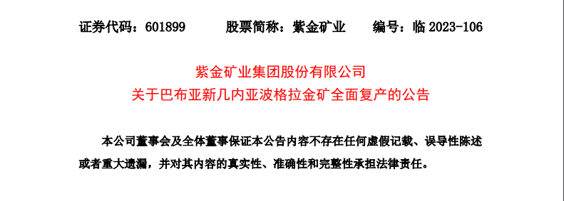 紫金矿业(601899)12月11日晚间公告,公司旗下位于巴布亚新几内亚的波格拉金矿已于近日达成全面复产所需的全部前提条件,并将于2023年12月22日正式启动复产。随着采矿及选矿等生产系统的恢复运转,波格拉金矿复产后第一批合质金预计将于2024年第一季度产出。