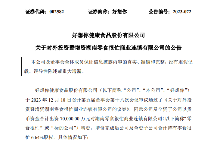 12月18日晚间,好想你(002582)发布公告,公司及全资子公司以货币资金合计出资7亿元对湖南零食很忙商业连锁有限公司(简称:零食很忙)增资,增资完成后公司及全资子公司合计持有零食很忙6.64%股权。由此计算,本次增资对零食很忙的投后估值达105.4亿元。