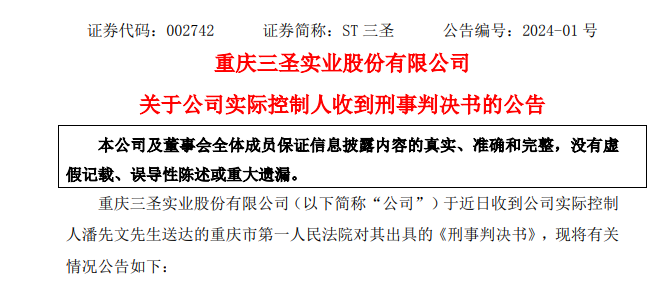 ST三圣(002742)实控人潘先文刑事判决结果出炉。