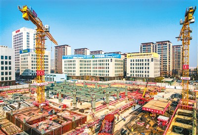 江苏省宿迁市电子商务产业园区电商大厦工程项目是市级重大产业项目,建成后将有助于推动当地电商产业发展。图为电商大厦工程施工现场,塔吊林立,工人正在加紧施工。