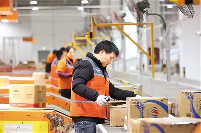 重庆市巴南区公路物流基地的一家物流企业内,工作人员正利用自动分拣系统分拣快递包裹,以应对不断攀升的电商物流需求。