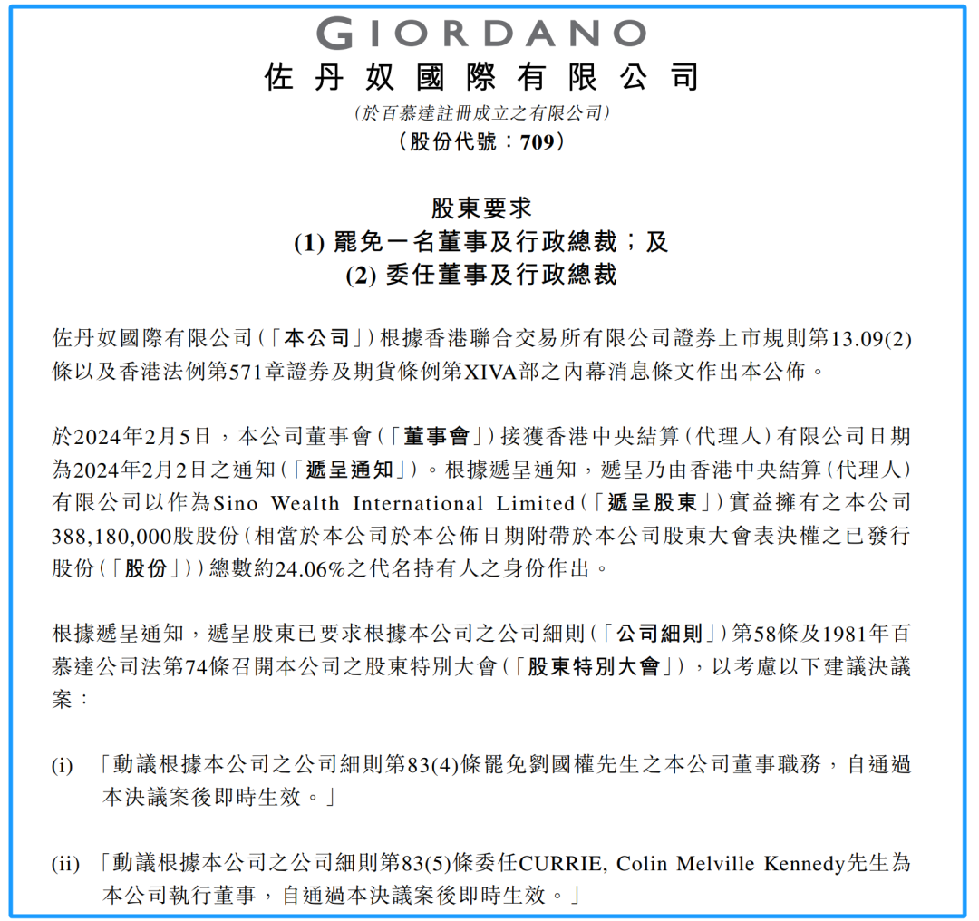 2月5日晚间,佐丹奴国际(00709)在港交所公告,周大福控股旗下公司Sino Wealth International Limited要求罢免佐丹奴国际长达30年的主席兼行政总裁刘国权的董事职务;委任周大福主席郑家纯的长女郑志雯及三子郑志亮,为佐丹奴非执行董事;以及委任adidas亚太及大中华区前总经理Colin Currie,为佐丹奴新CEO。