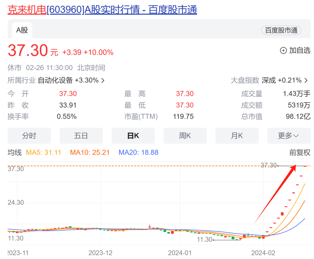 个股方面,克来机电今日早盘再度一字涨停,已经连续12个涨停。公司不断提示风险,并为监事亲属短线交易致歉,仍然挡不住市场热情。目前,克来机电已经连续12个涨停,股价已经涨幅高达214%。