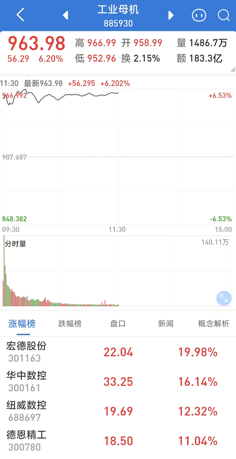 机械设备产业链相关股早间全线高开高走,其中工业母机概念一马当先,板块指数盘中放量飙升近7%,半日成交超前一交易日全天成交。宏德股份开盘20%一字涨停,华东重机、华东数控、日发精机、海天精工等亦批量开盘涨停。