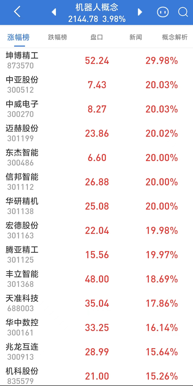 机器人概念早间亦大幅高开高走,板块指数大涨近4%。板块内个股掀起涨停潮,中威电子、华研精机等20%涨停,克来机电连续12日涨停,机器人、江苏北人、奥拓电子等逾40股涨停或涨超10%。
