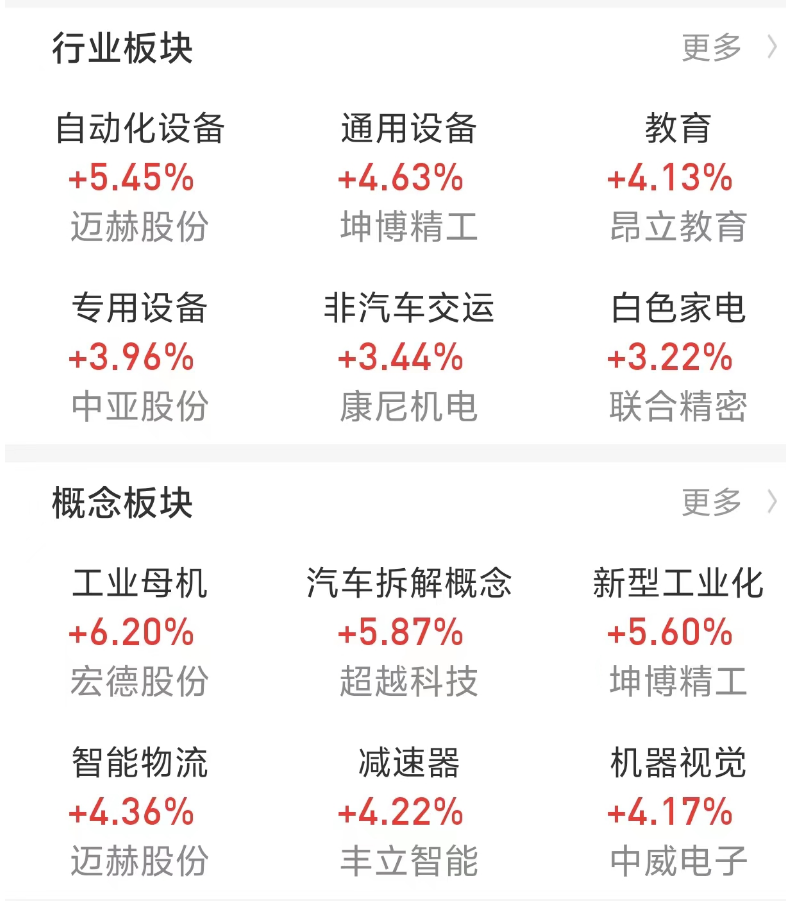 新型工业化、通用机械、运输设备、高端装备等板块亦跟随走强,坤博精工30%涨停,中亚股份、迈赫股份、信邦智能、东杰智能等纷纷20%涨停。工业母机ETF开盘涨近6%,位居涨幅榜首,机床ETF亦大涨近5%,紧随其后。