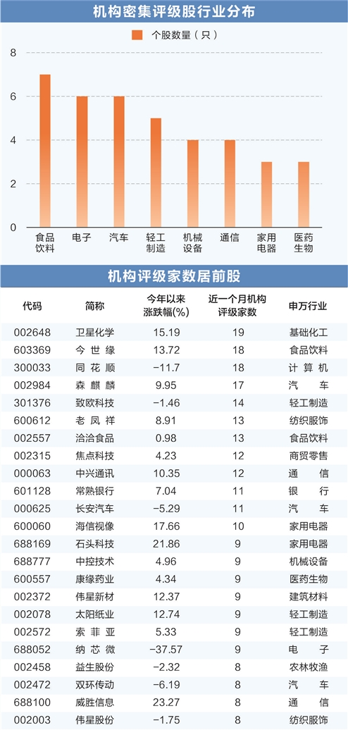 证券时报·数据宝统计,近一个月,共56股获得5家以上机构给予“积极型”评级(含买入、增持、强烈推荐等评级)。分行业看,食品饮料、电子、汽车、轻工制造行业较为集中,均有5只及以上股票入围。