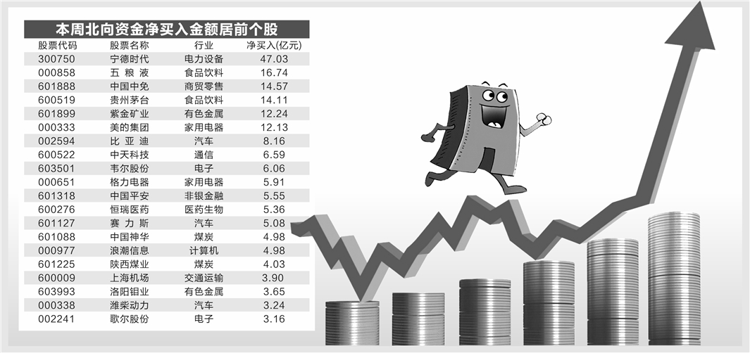 新能源产业所属的电气设备行业受到北向资金重点关注,净买入逾52亿元;白酒股也成为本周北向资金加仓重点,所属食品饮料行业获得逾46亿元净买入;有色金属、家用电器、汽车3行业也获得超20亿元净买入。公用事业、传媒、钢铁等行业则被净卖出超亿元。