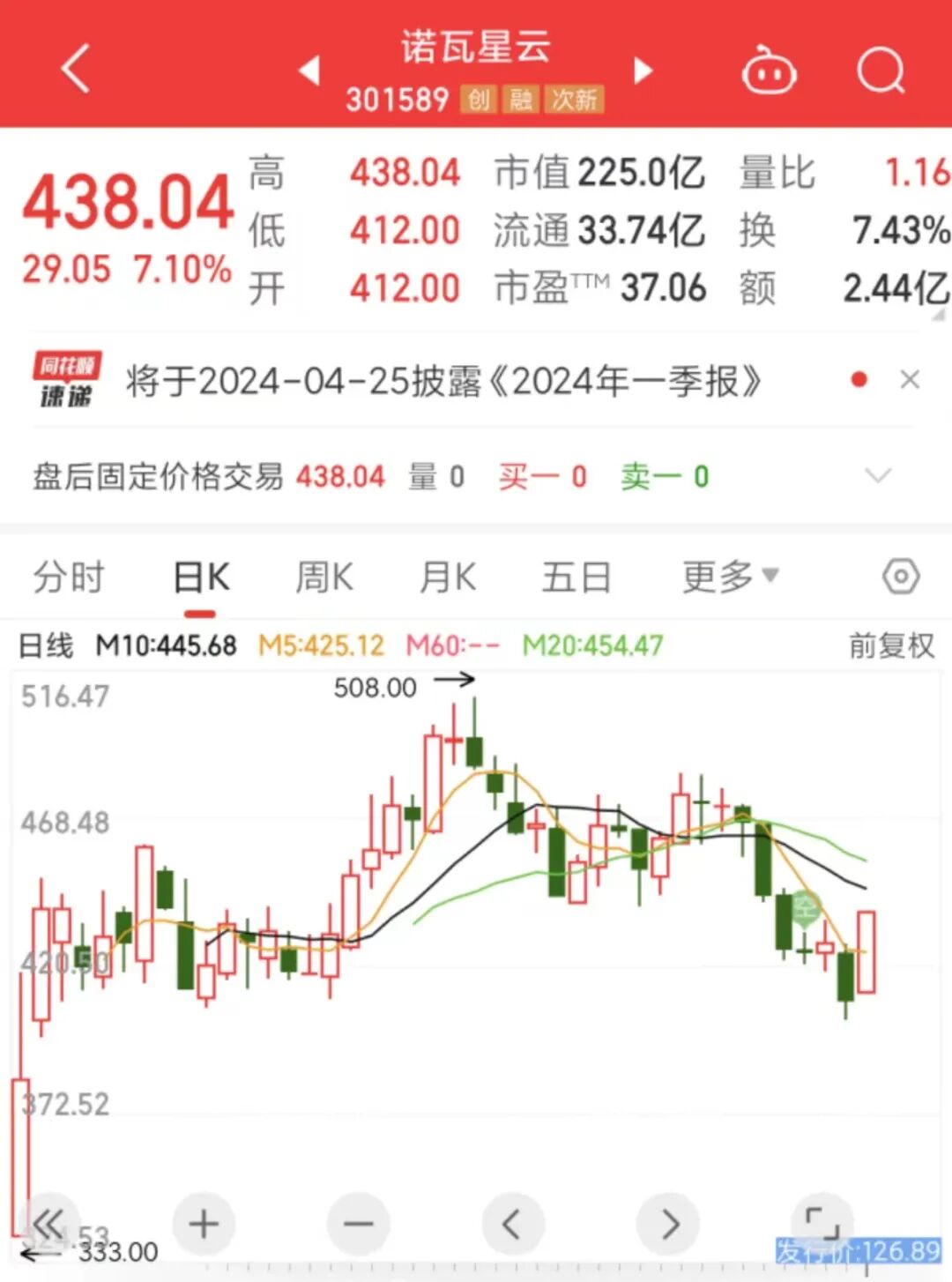 诺瓦星云上市发行价格为126.89元/股,上市首日开盘后,该公司股价便一路狂奔,最高涨幅达229.96%,至418.68元。此后该公司股价也持续上行,到3月19日突破500元/股,截至4月17日收盘,该公司股价报438.04元/股。