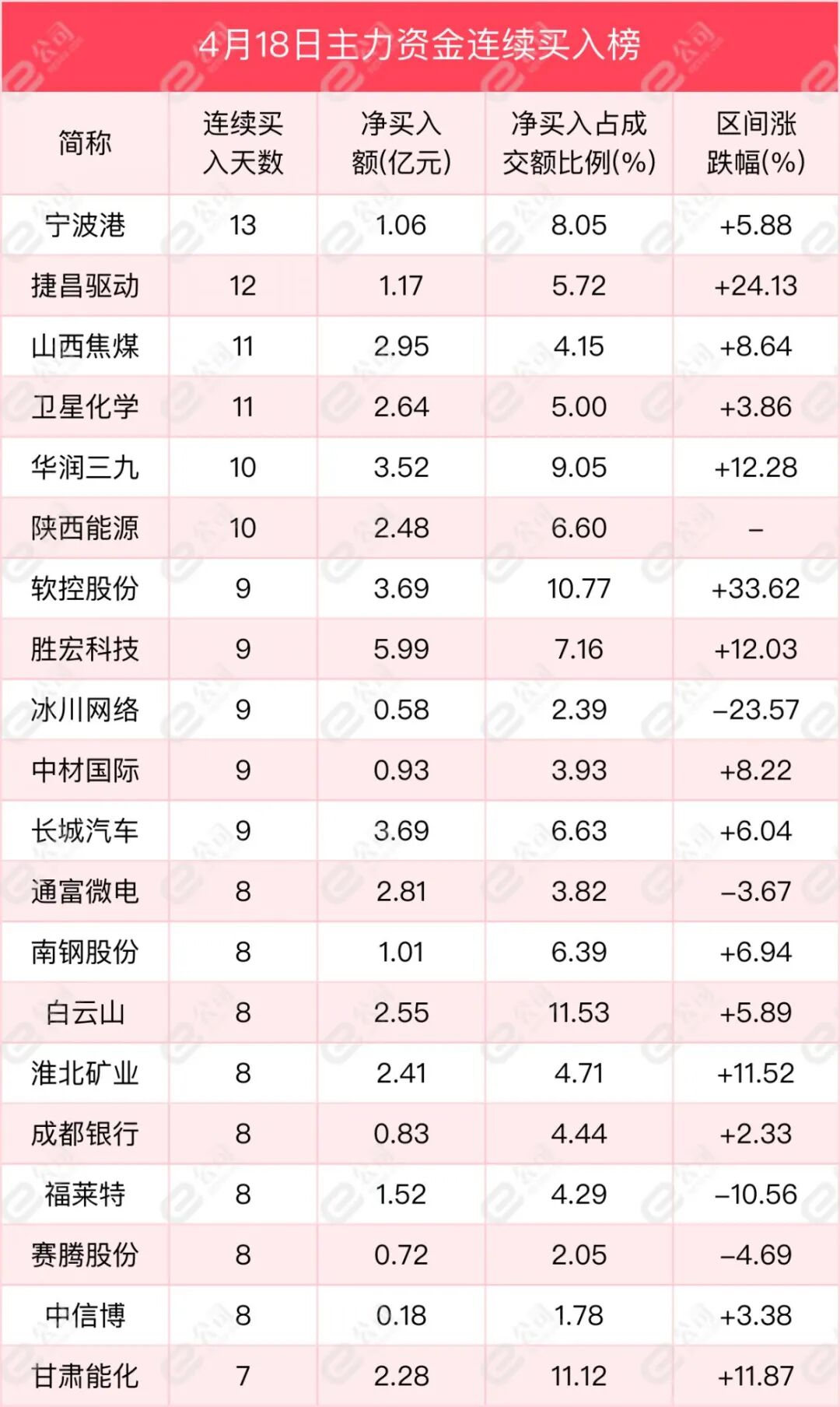 从连续买卖来看,宁波港、捷昌驱动、山西焦煤获主力资金连续净买入天数居前,分别为13天、12天、11天,期间净买入额分别为1.06亿元、1.17亿元、2.95亿元,占期间成交额比例分别为8.05%、5.72%、4.15%。