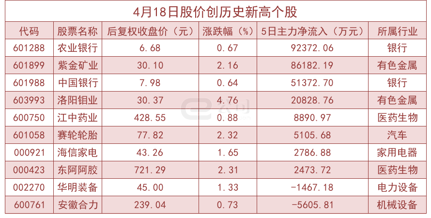 截至4月18日最新收盘,两市共有10只个股股价创历史新高。其中农业银行、紫金矿业、中国银行等5日主力资金净流入较为明显。