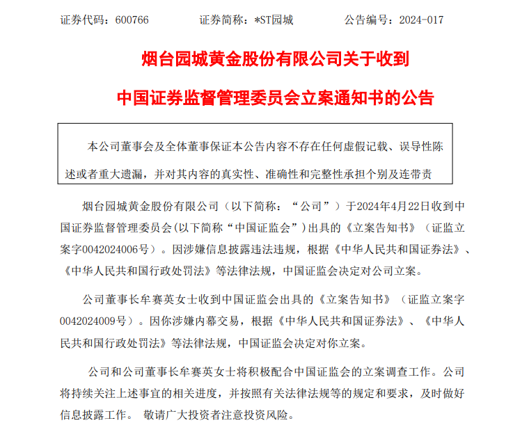 *ST园城4月22日晚间披露,公司和公司董事长牟赛英女士分别收到证监会出具的《立案告知书》。其中,上市公司因涉嫌信息披露违法违规遭证监会立案调查,牟赛英则是因涉嫌内幕交易被查。截至目前,外界未知*ST园城涉嫌信披违法违规的具体事项。