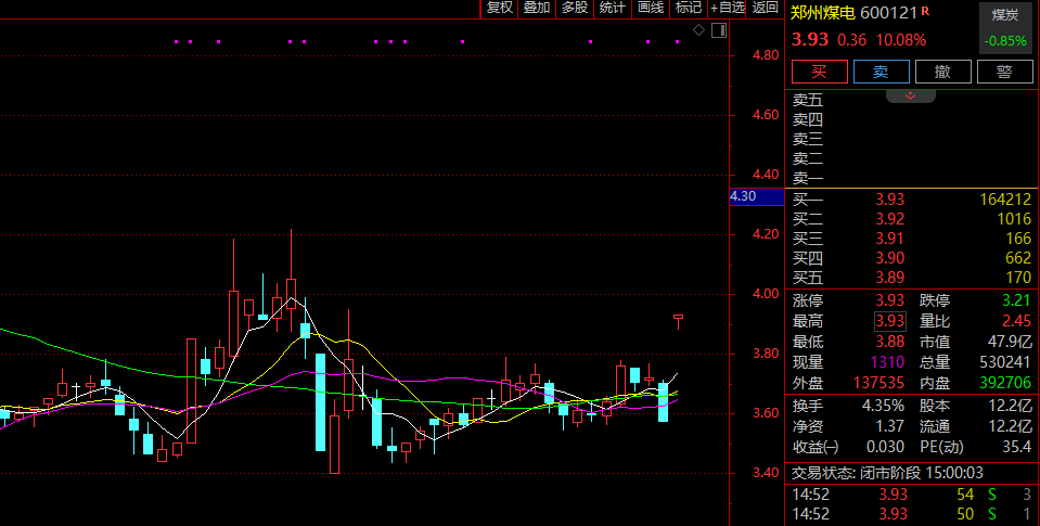 5月24日,郑州煤电(600121)开盘一字涨停,截至当日收盘,该公司股价报3.93元/股,成交额2.08亿元,总市值47.88亿元,封板资金6453.53万元。