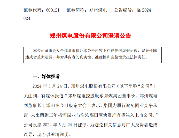 为避免相关信息对广大投资者造成误导,5月24日晚间,郑州煤电发布澄清公告,对相关情况予以澄清说明。