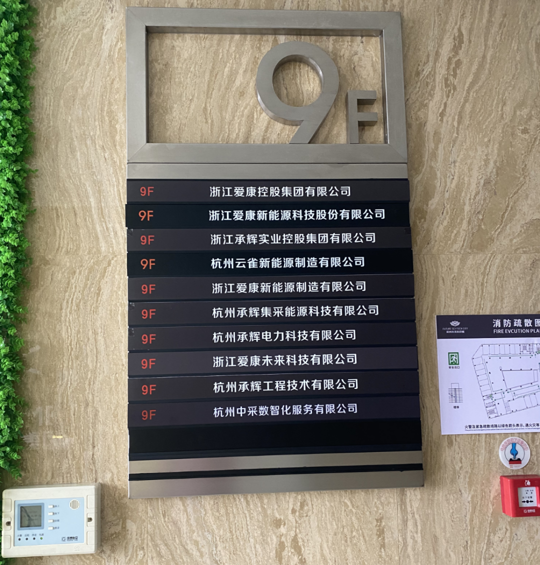 ST爱康、承辉国际所在的9楼,也是“爱康系”公司的集中办公地。楼层索引图显示,共处一层的公司包括浙江爱康控股集团有限公司、浙江爱康新能源科技股份有限公司(ST爱康的全称)、浙江爱康新能源制造有限公司、浙江承辉实业控股集团有限公司等共计10家公司。