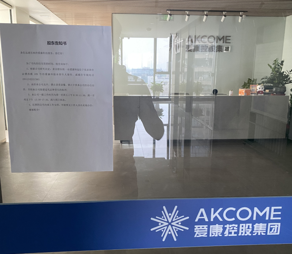 6月13日,记者赶到“爱康系”杭州总部时,大门上还贴着一张《股东告知书》。不过,6月14日,这张《股东告知书》,已被撕掉。
