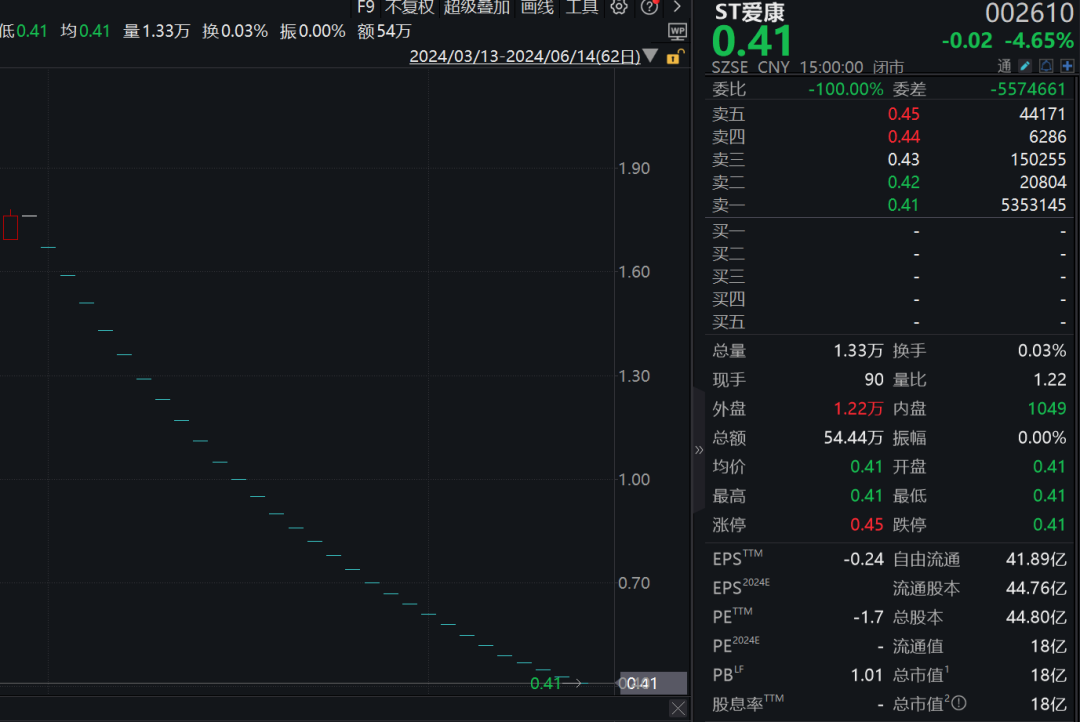 ST爱康(002610)已锁定退市,连续29个交易日跌停后,日成交额低至50万元,持有公司股票的投资者逾27万户,几乎没有出逃的机会。