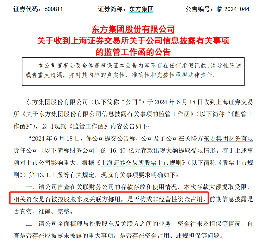 6月18日,东方集团当日就火速收到上海证券交易所《关于东方集团股份有限公司信息披露有关事项的监管工作函》,监管就有关事项要求作出明确。