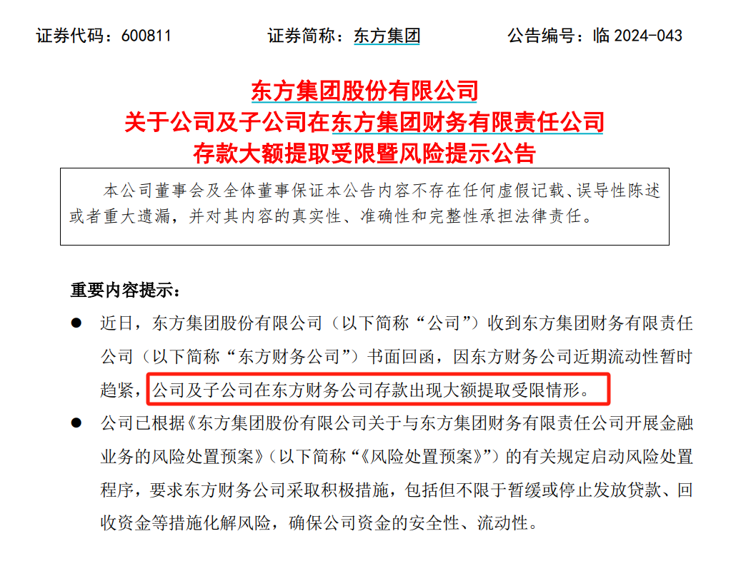 不过,落地推进并非顺利。近日,东方集团收到东方财务公司书面回函,因东方财务公司近期流动性暂时趋紧,东方集团及子公司在东方财务公司存款出现大额提取受限情形。