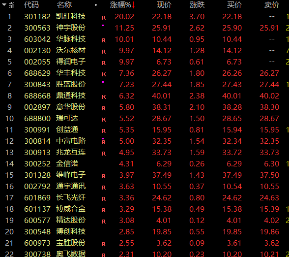 凯旺科技由盘初跌逾3%,直线拉升仅约10分钟就20%涨停,股价创5个多月来新高;沃尔核材同样仅用约6分钟就快速涨停,华脉科技、得润电子等也均直线拉涨停。