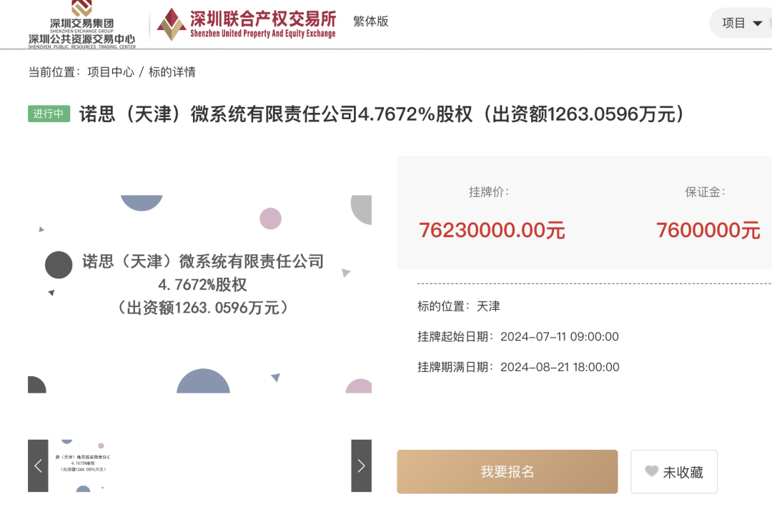 根据深圳联合产权交易所最新披露的信息,自然人卫伟平拟将其持有的诺思(天津)微系统有限责任公司(或称“诺思”)4.7672%股权予以挂牌转让,挂牌价为7623万元,挂牌期为7月11日至8月21日。