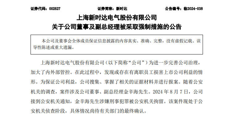 8月9日晚间,新时达(002527)突发公告称,公司董事及副总经理金辛海被采取强制措施。