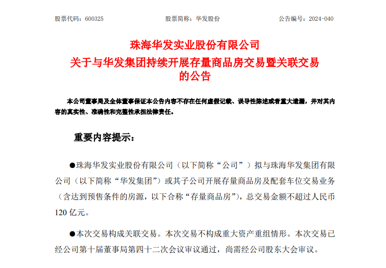 A股上市公司华发股份(600325)8月9日下午披露,公司拟与珠海华发集团有限公司(下称“华发集团”)或其子公司开展存量商品房及配套车位交易业务(含达到预售条件的房源,合称“存量商品房”),总交易金额不超过120亿元。