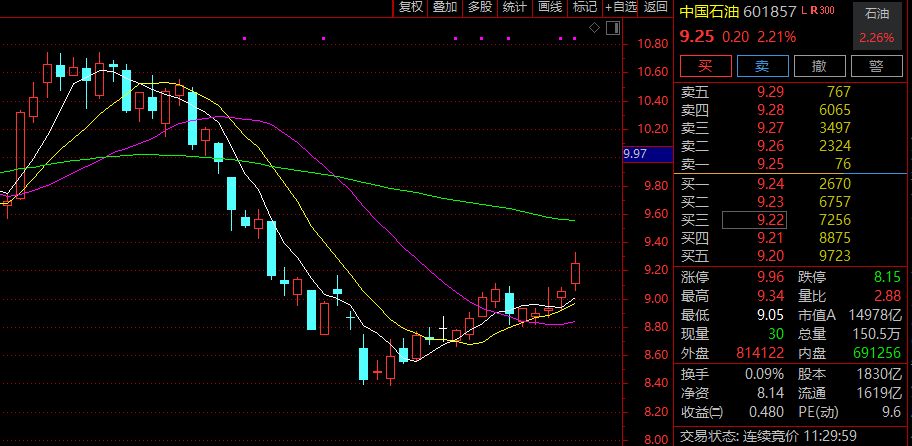 高股息股早间再度全线走强,石油板块在中国石油发布半年报,并大额现金分红的刺激下,逆势放量高开高走,板块指数盘中一度大涨近3%,创近1个月来新高。中国石油最高涨近3%,仅1小时成交就超过昨日全天成交;中国石化亦大涨逾4%,连续第5日上扬,股价创2009年7月以来15年新高(复权,下同);海油发展、准油股份、中国海油等也纷纷逆势拉升。