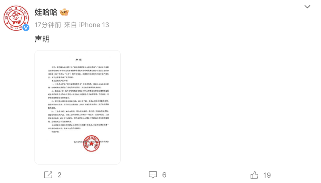 娃哈哈表示,以上报道严重失实,对杭州娃哈哈集团有限公司工会联合会委员会(以下简称“工会”)名誉造成了极大损害。
