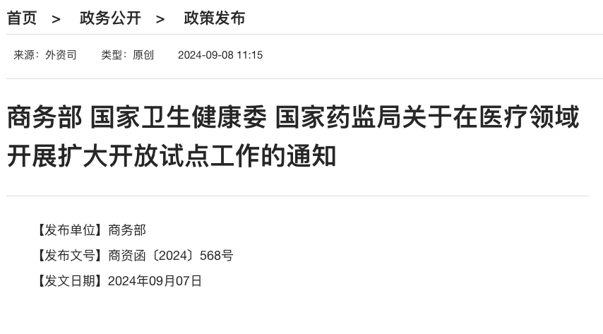 9月8日,商务部、国家卫生健康委、国家药监局发布《关于在医疗领域开展扩大开放试点工作的通知》。