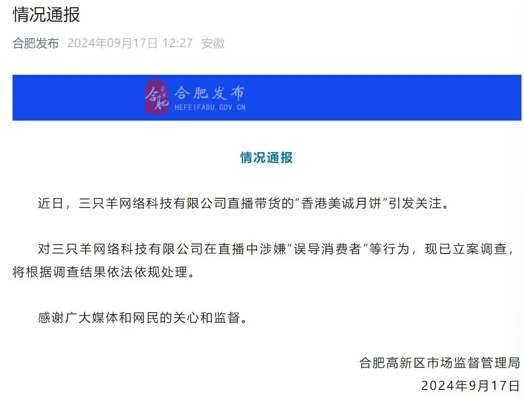 9月17日,合肥高新区市场监督管理局发布通报称,对三只羊网络科技有限公司在直播中涉嫌“误导消费者”等行为,现已立案调查,将根据调查结果依法依规处理。