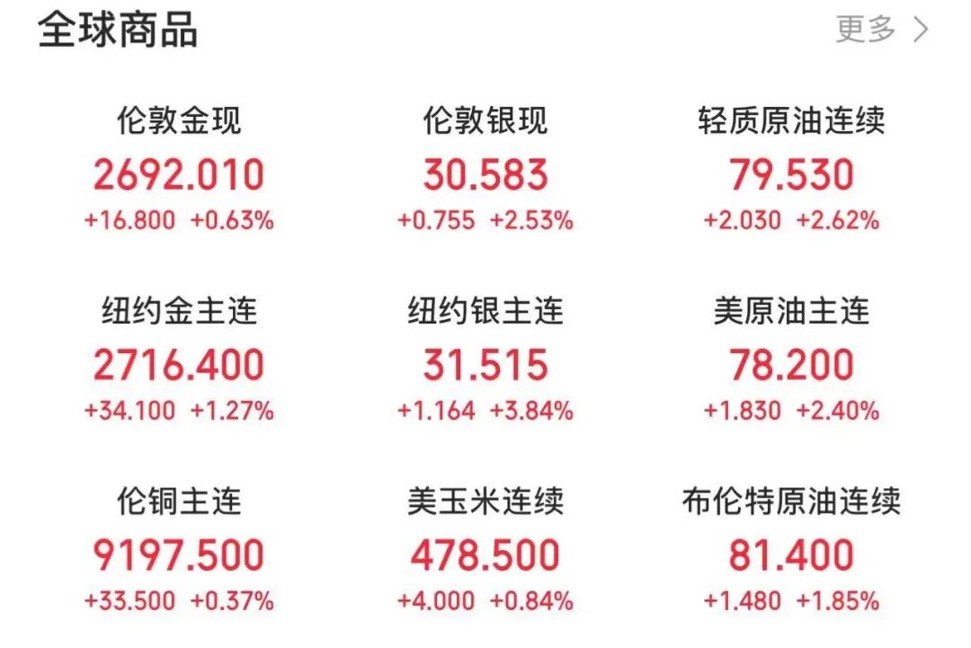 截至收盘,道指涨1.65%、标普500指数涨1.8%,纳指涨2.45%。WTI原油期货涨3.28%,报80.04美元/桶。布伦特原油期货涨2.64%,报82.03美元/桶。周三纽约尾盘,现货黄金涨0.64%,报2694.55美元/盎司;现货白银涨2.32%,报30.5840美元/盎司。