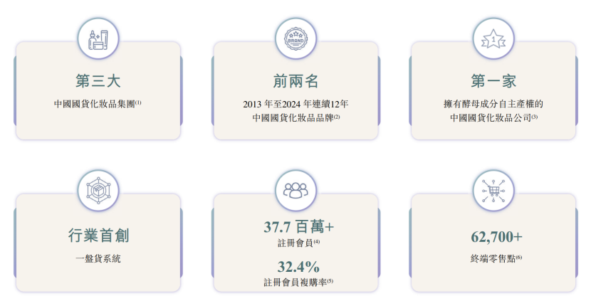 根据弗若斯特沙利文的资料,以2024年零售额计,自然堂是中国第二大的国货化妆品品牌。根据弗若斯特沙利文调研,自然堂亦在消费者认可度、购买频率及复购意愿方面在所有受调研的大众国货化妆品品牌中排名第一。