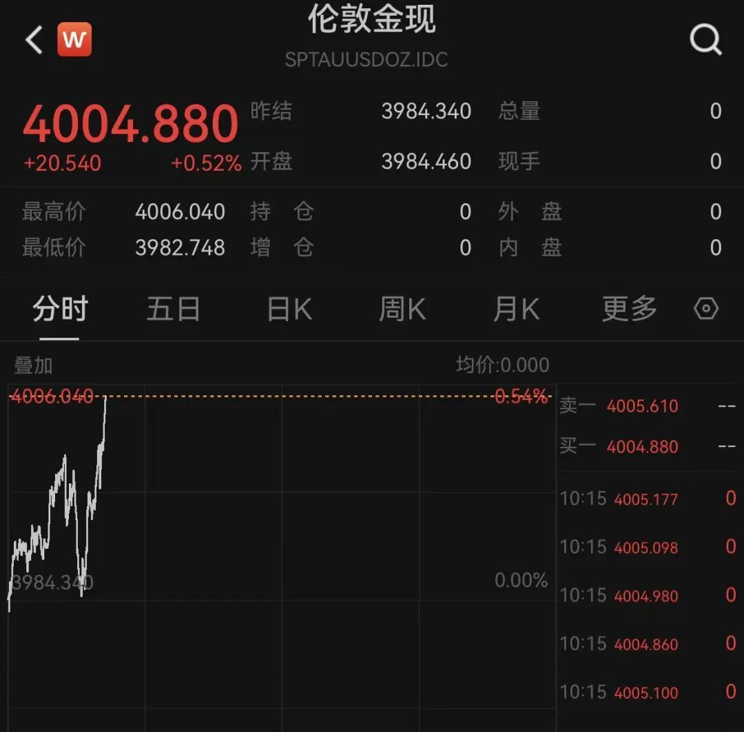现货黄金再度拉涨,冲上4000美元/盎司,为史上首次,再创历史新高。