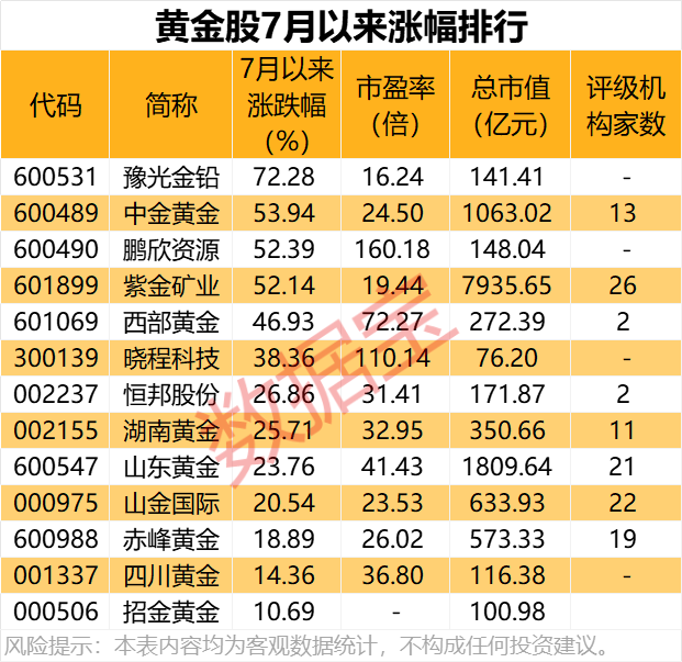 据证券时报·数据宝统计,A股中黄金板块个股共有13只,下半年以来平均上涨35.14%,豫光金铅、中金黄金、鹏欣资源涨幅居前,分别达到72.28%、53.94%、52.39%。招金黄金、四川黄金、赤峰黄金相对滞涨,累计涨幅均在20%以内。
