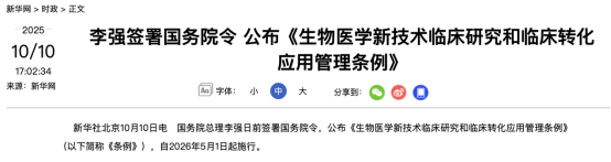 10月10日,据新华社,国务院总理李强日前签署国务院令,公布《生物医学新技术临床研究和临床转化应用管理条例》(以下简称《条例》),自2026年5月1日起施行。