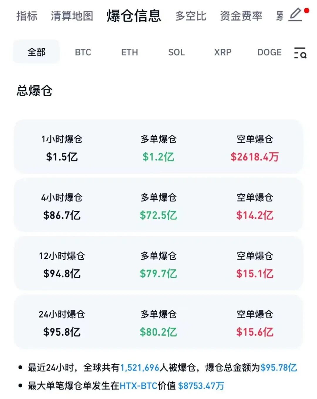 根据Coinglass数据,近24小时全球共有超过152万人爆仓,爆仓总金额达95.78亿美元。