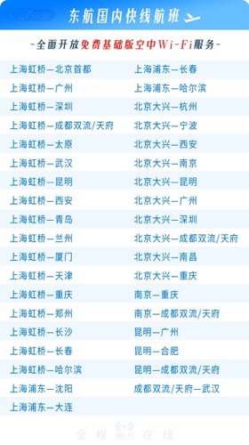 人民财讯10月11日电,记者从中国东方航空了解到,从10月11日起,该航司所有宽体机执行的国内“空中快线”航班提供经济舱全舱位免费Wi-Fi服务,满足旅客空中用网免费、上网便捷的需求。
