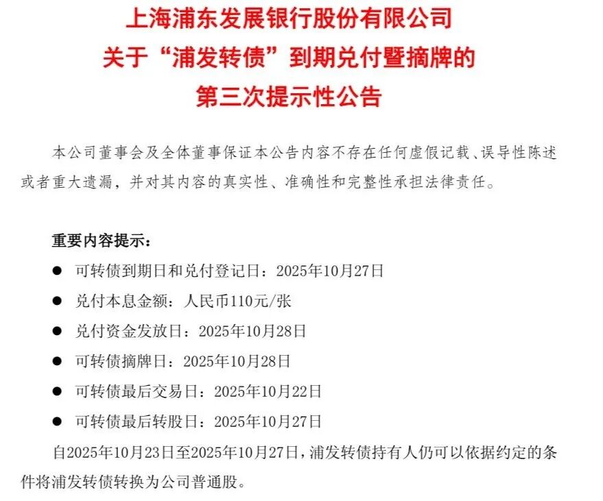 在停止交易后、转股期结束前(即自10月23日至27日),浦发转债持有人仍可以依据约定的条件将浦发转债转换为公司普通股。10月28日,浦发转债将在上交所摘牌。