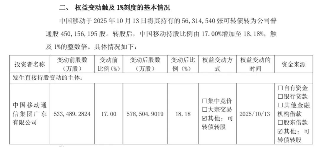 最新公告显示,中国移动于10月13日将其持有的5631.454万张可转债转为浦发银行普通股4.5亿股。转股后,中国移动持股比例由10月10日的17%增加至18.18%,触及1%的整数倍。