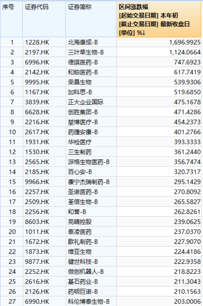 在这一背景下,港股市场今年的医药大牛股频出,尤其是18A公司表现亮眼。Wind数据显示,在260家Wind医疗保健公司中,有27家公司今年以来的涨幅超过200%,其中绝大部分是18A公司。
