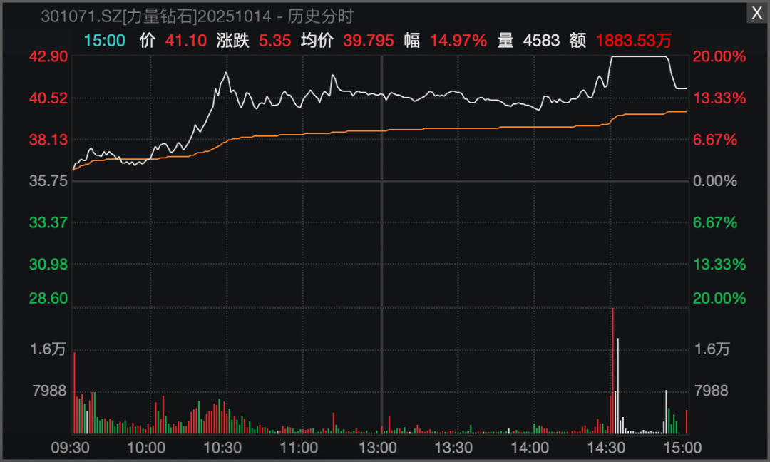 市场热点方面,培育钻石概念今日高开高走,板块指数一度放量涨近6%,创历史新高。黄河旋风临近收盘封死涨停,股价创年内新高;力量钻石尾盘一度触及20%涨停,惠丰钻石、四方达、曼卡龙等在尾盘均出现异动拉升的走势。