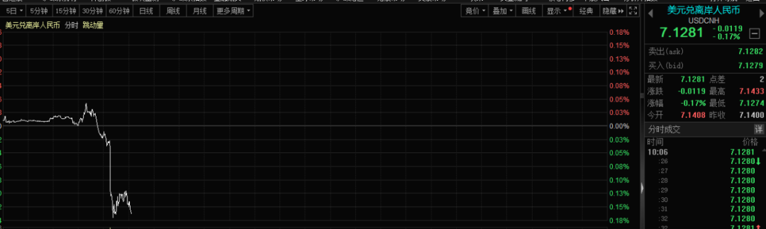 今天早上,人民币中间价升至7.10元上方,为去年11月来首次。人民币兑美元中间价报7.0995,上调26点;上一交易日中间价7.1021,上一交易日官方收盘价7.1411。随后,离岸人民币直线拉升。