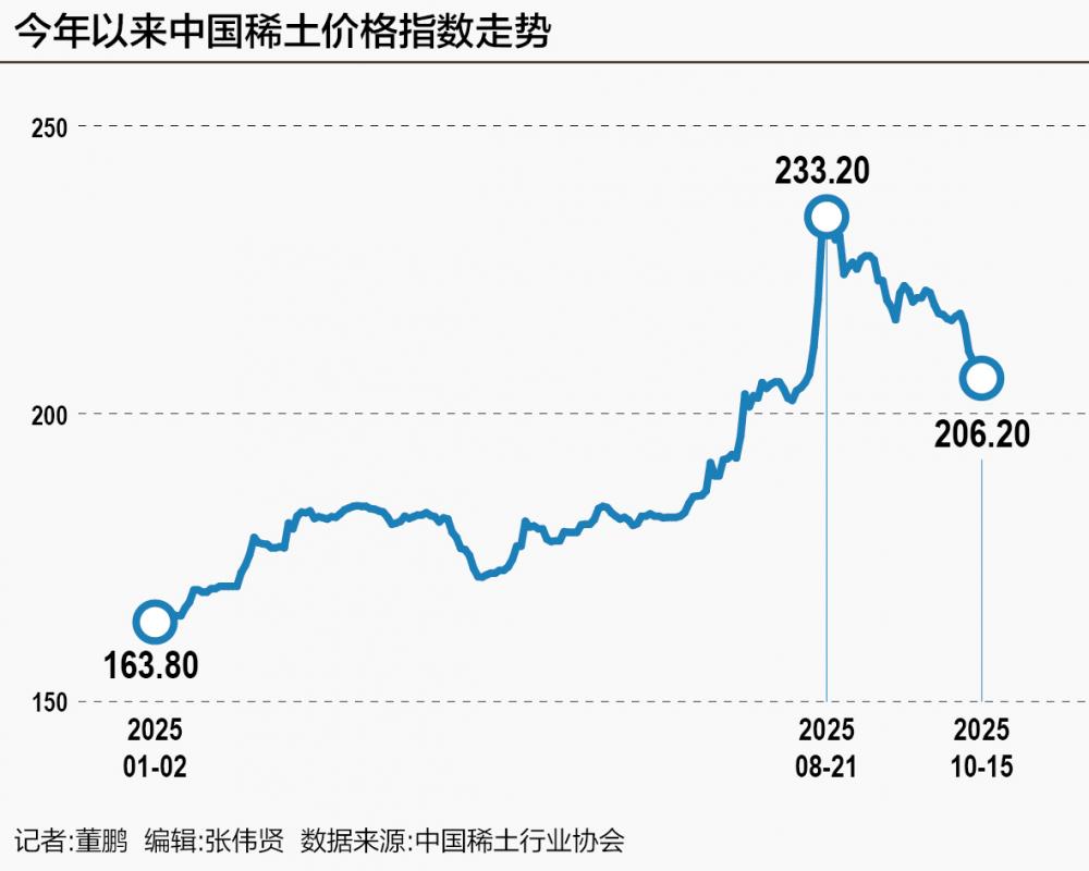 仅以中国稀土行业协会的稀土价格指数为例,今年7月、8月该指数便出现一轮明显上行,并于8月中旬创下233点的年内新高,较2024年末上涨近43%。