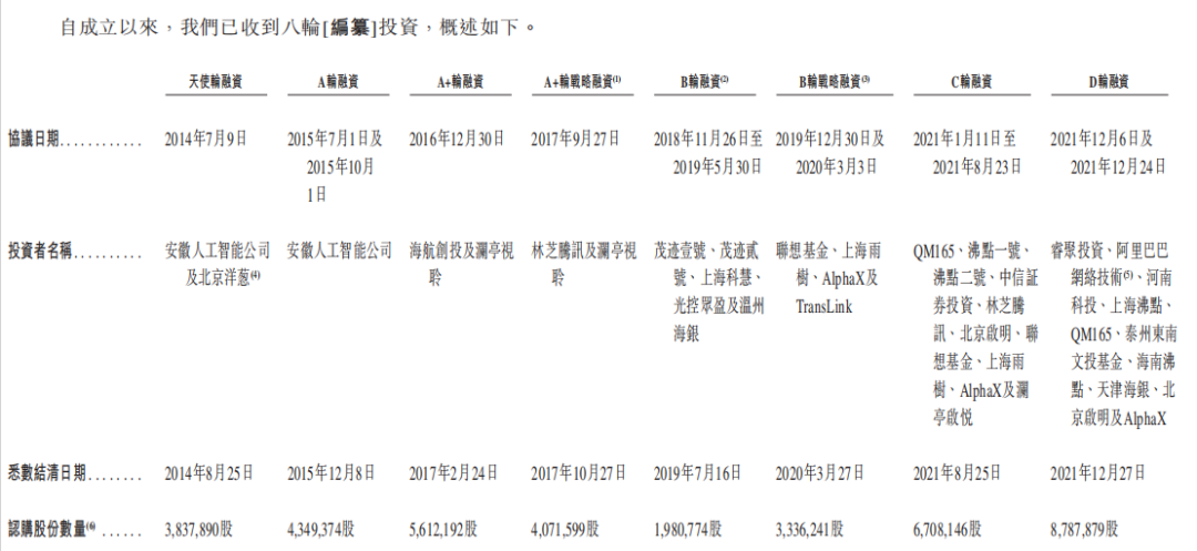 据招股书资料,2014年7月至2021年12月,公司先后进行了8轮融资,包括天使轮融资、A轮融资、A+轮融资、A+轮战略融资、B轮融资、B轮战略融资、C轮融资及D轮融资,背后出资方包括启明创投、腾讯、联想基金、阿里巴巴、携程、科大讯飞等。