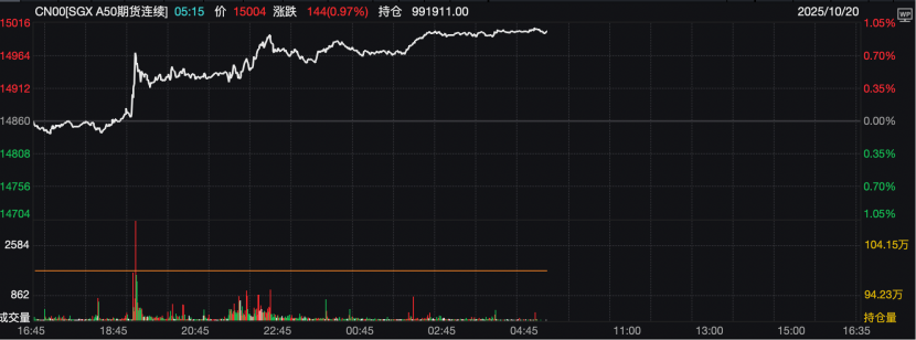 此外,富时中国A50指数期货盘中直线拉升,随后不断反弹走高,盘中最大涨幅超1%。