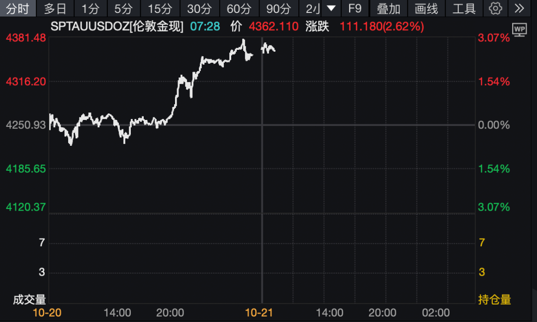 贵金属维持强势。国际现货黄金20日收涨2.45%后,21日开盘继续拉升,最新报4362.11美元/盎司,24小时内涨超100美元。