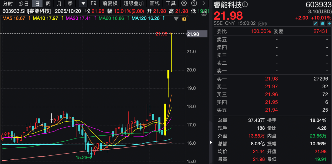 10月20日,睿能科技(603933)股价早盘再度冲高至涨停板,当日收于21.98元/股,这已是该公司股价连续第三个交易日涨停。