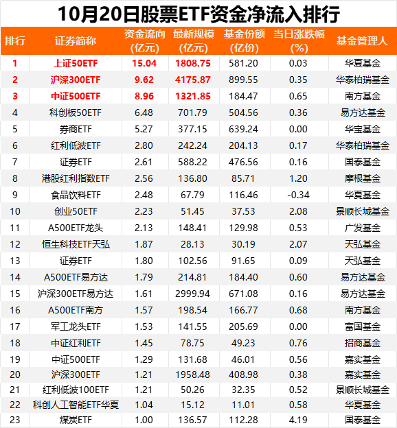 股票ETF继续迎来资金净申购。Wind数据显示,10月20日股票ETF市场总份额增加14.96亿份,按照成交均价测算,当日净流入资金约为24.95亿元。